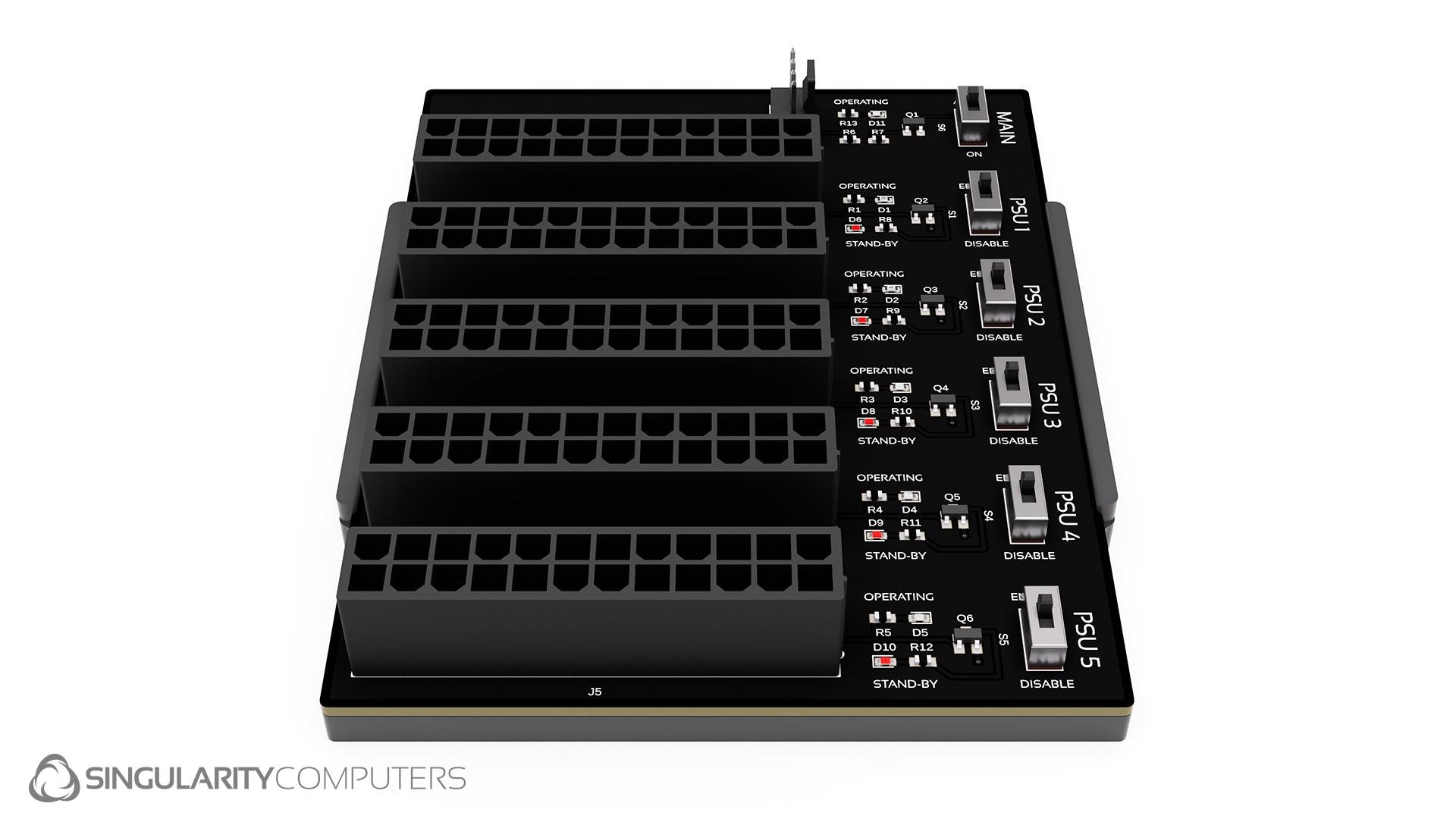 A custom designed Singularity Computers hub with high quality components and a dual layer PCB. The PCB and connectors are black with white logos and labelling. This hub is for switching on multiple PSUs from one main PSU. It has a main switch which switches between Auto Mode which turns on the PSUs when the system is turned on, and On Mode which turns on the PSUs regardless of the main system being on. There is also a switch for each PSU to enable or disable it so that you can run 1, 2, 3, 4 or 5 PSUs. There are operating LEDs to show if each PSU is on and stand by LEDs to show if the connected PSUs are in standby mode (powered by mains but turned off).