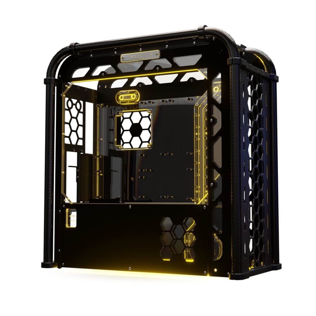 Dominus Workstation Water-cooling Case is an extreme water-cooling case designed for SSI motherboards and up to x7 GPUs. It has a frame built from 26mm Carbon Fiber tubes, billet aluminum clamps and 3mm aluminum panels. It has an integrated distribution plate with a D5 and reservoir and parts of the loop. It fits a 360mm and 480mm radiator. Compared with the original version of Dominus this version has a larger side panel window cutout and it has a single distribution plate around the motherboard. It also doesn’t include the PowerBoard to allow for SSI-EEB and EEB motherboard compatibility. It also comes with satin black covers for both sides of the case by default and various color and finish options can be selected along with Carbon Fiber.
