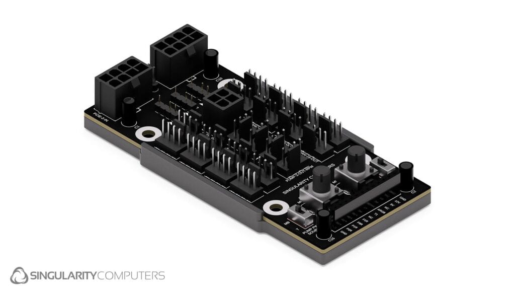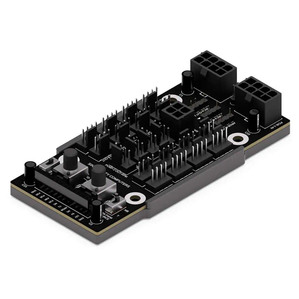 A custom designed Singularity Computers active powered PWM hub with high quality components and a dual layer PCB. The PCB and connectors are black with white logos and labeling. It has PWM inputs for the fans and pumps. Only the outputs labeled FAN-1-OUT-RPM and PUMP-OUT displays RPM so there are no RPM conflicts from the other PWM connections. The hub has 2 active PWM control circuits to adjust the speed of the connected fans and pumps based on the temperature of the coolant without the need for a motherboard. The potentiometers adjust the PWM speed response to the temperature reading while the switches allow choosing between motherboard and temperature based local PWM speed control. It also has a dedicated 4pin ATX connector to power up to 2x pumps.