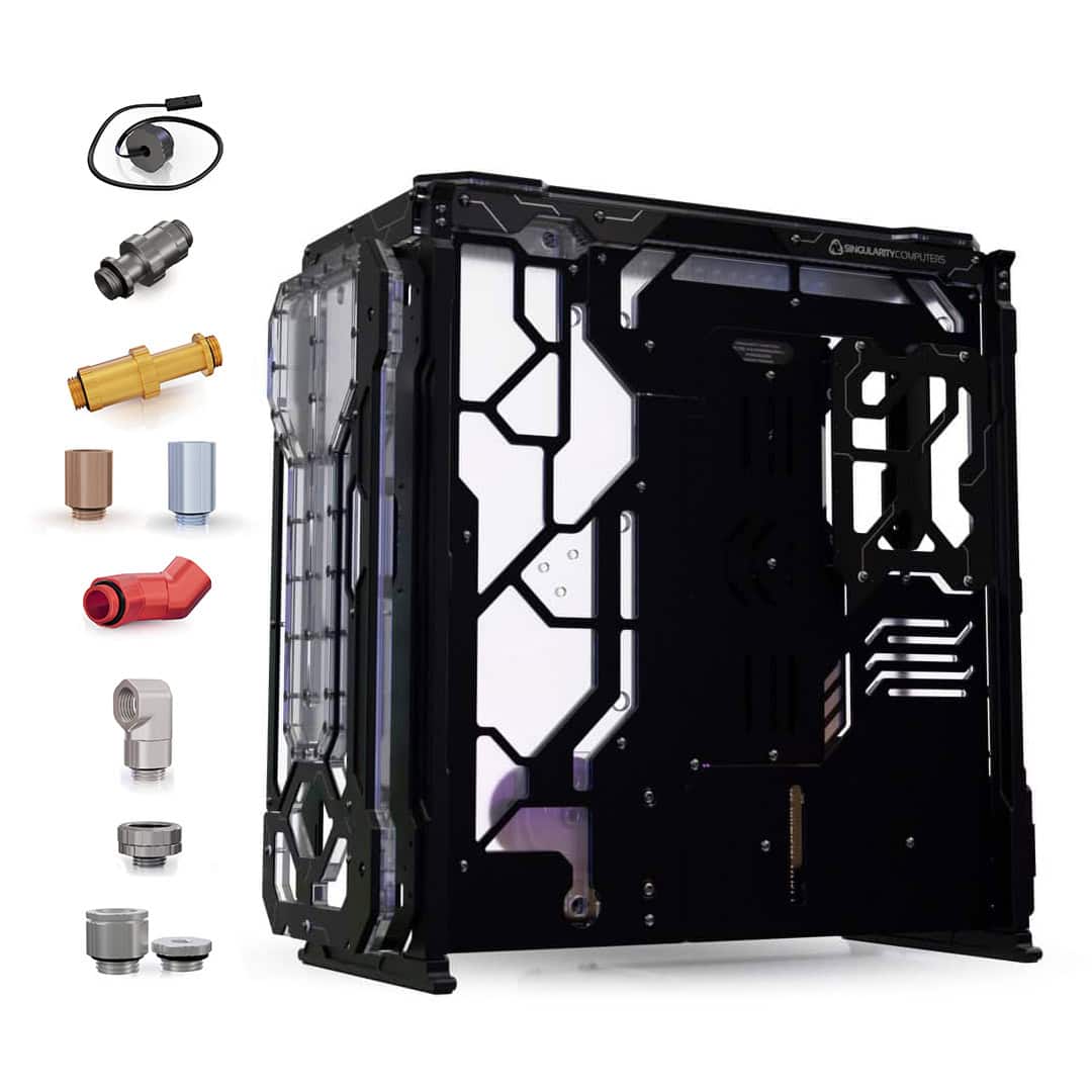 We have a Singularity Computers Cerakote Fittings package which is designed for each case and is based on the way we would build the system and route the loop. With any Singularity Computers Case purchase you will receive full support which means that if you need any help with any aspect of the building (including the loop building and fittings) we will provide it. You will receive a 20% discount on all Fittings packages.