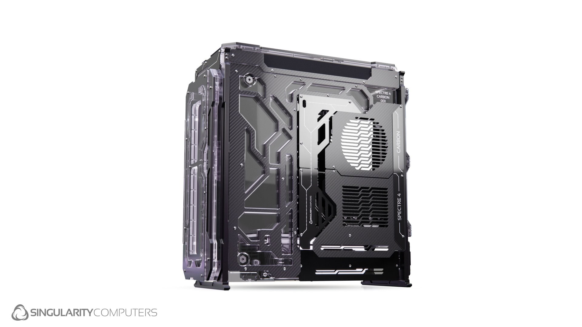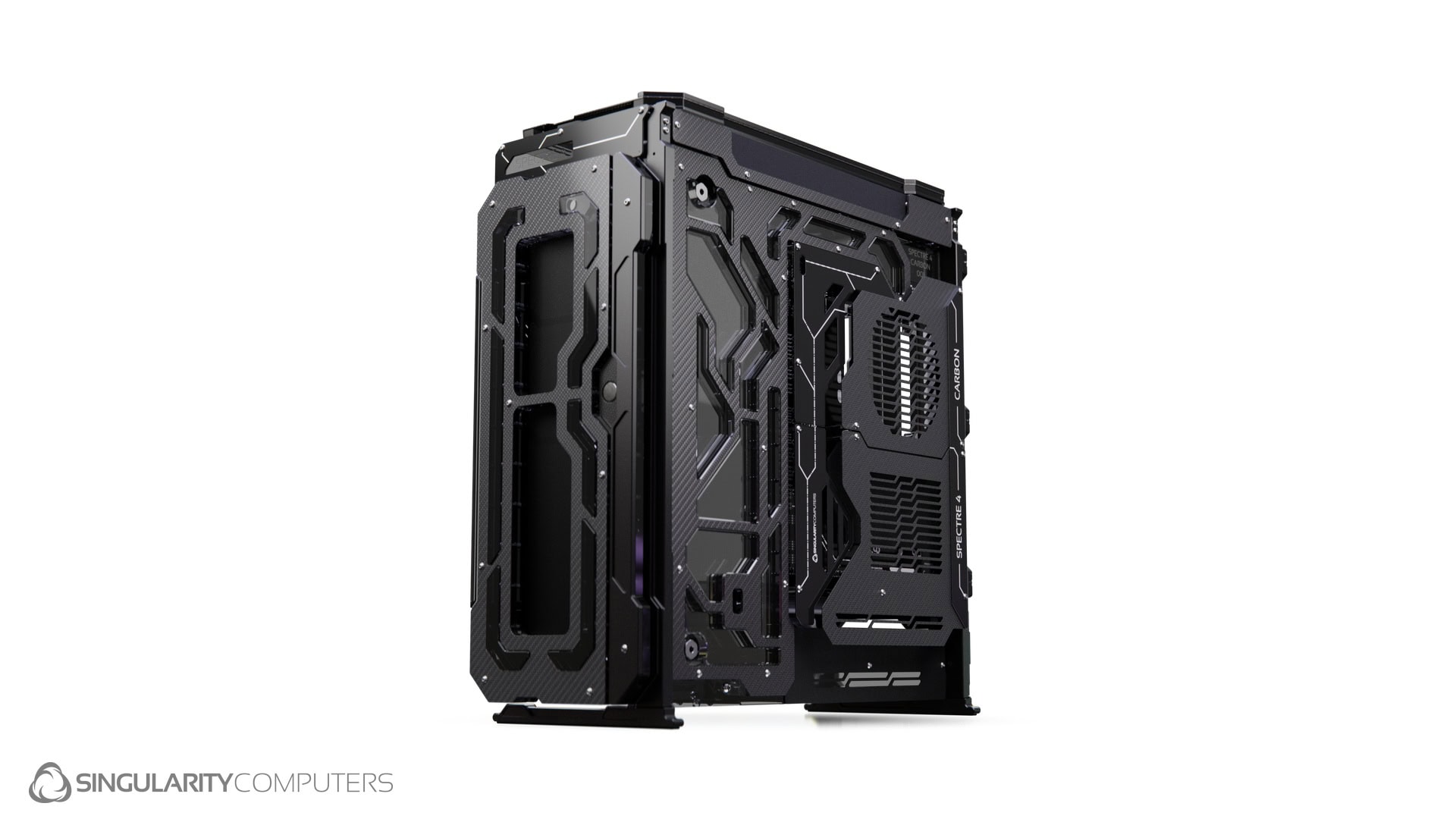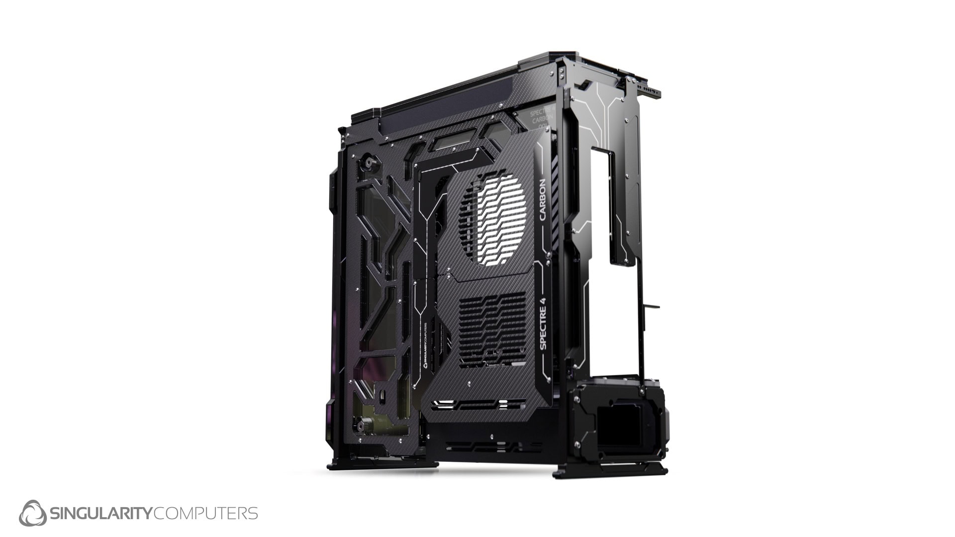 The theme for Spectre 4 Carbon is the core Singularity Computers theme, our name has multiple meanings but, in this case, it is a black hole. This is our first Spectre case using Carbon Fiber. There are Carbon Fiber covers on many sections of the case, particularly on the distribution plates. Spectre 4 Carbon has an all-new distribution plate design with the integrated PowerBoard fully accessible from the rear of the case. The PowerBoard can be removed from the back making the case easier to build into and to work on. The PowerBoard also has the controls for the temperature-based RPM control facing the back, accessible by removing one of the back covers.