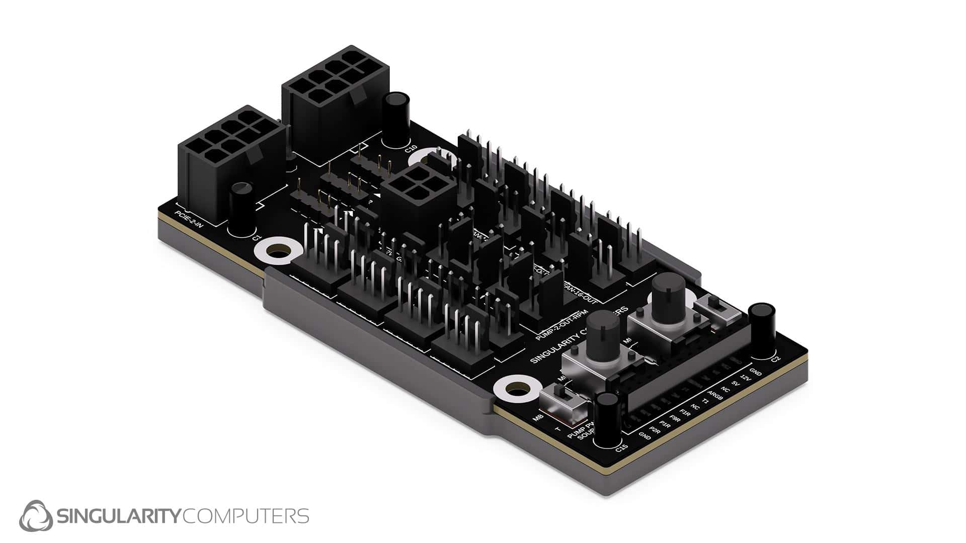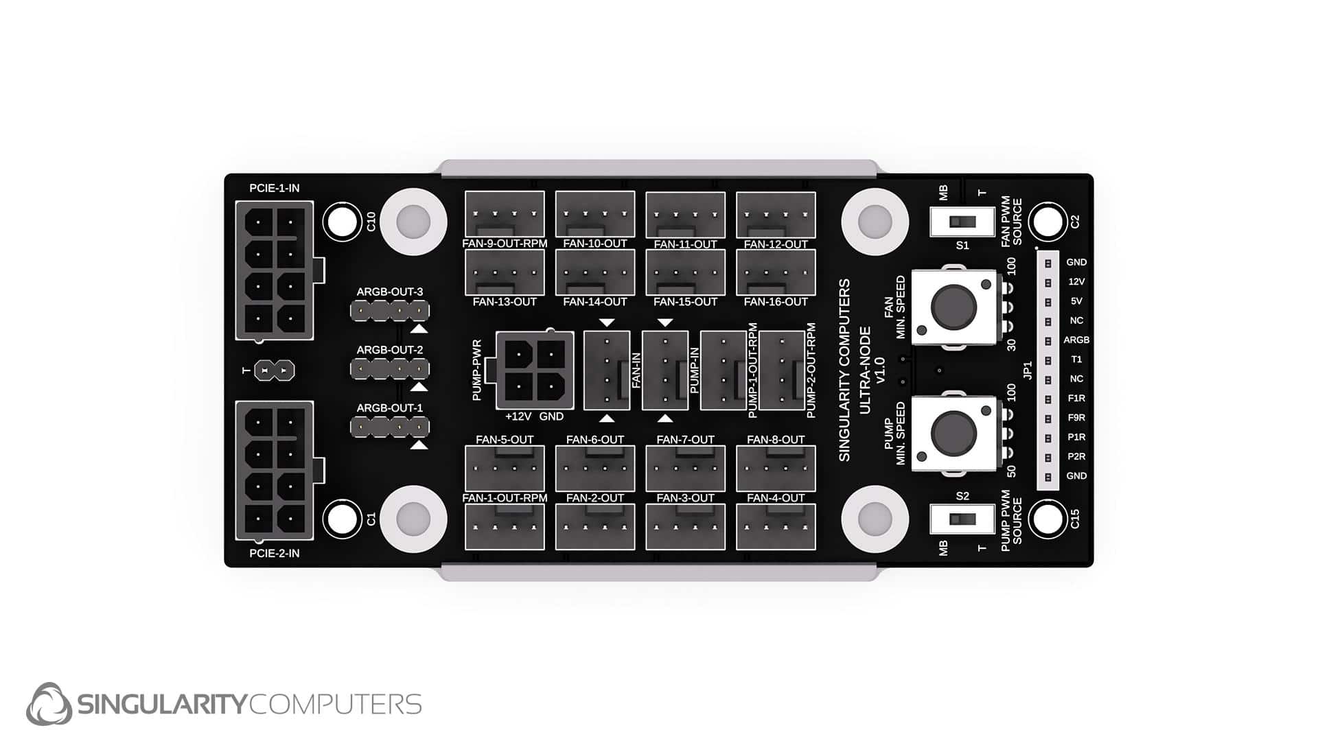 A custom designed Singularity Computers active powered PWM hub with high quality components and a dual layer PCB. The Ultra-Node is similar to the Mega-Node except that it has a connection for the FanGuardian PowerBoard Controller, and it has three ARGB connections. From the FanGuardian you can control ARGB lighting and you can monitor all RPMs, temperatures and voltages. Combined with the FanGuardian the Ultra-Node is a standalone management and monitoring system for a water-cooling loop, and it is an ARGB controller. The PCB and connectors are black with white logos and labeling. It has PWM inputs for the fans and pumps. Only the outputs labeled FAN-1-OUT-RPM and PUMP-OUT-RPM displays RPM so there are no RPM conflicts from the other PWM connections. The hub has 2 active PWM control circuits to adjust the speed of the connected fans and pumps based on the temperature of the coolant without the need of a motherboard. The potentiometers adjust the PWM speed response to the temperature reading while the switches allow choosing between motherboard and temperature-based local PWM speed control. It also has a dedicated 4pin ATX connector to power up to 2x pumps.